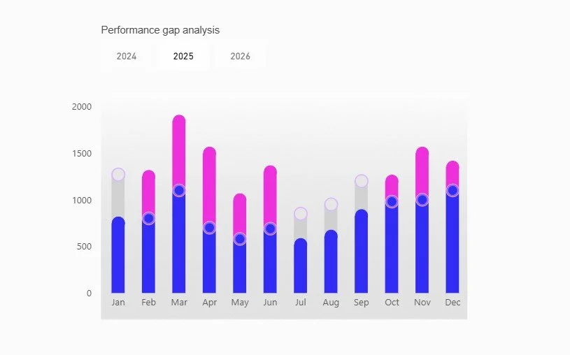Analyse the gap between actuals and benchmarks. With Power BI native visuals and visual calculations.